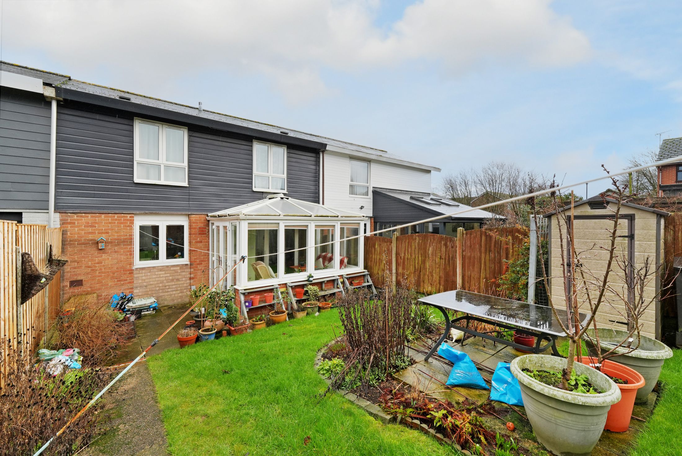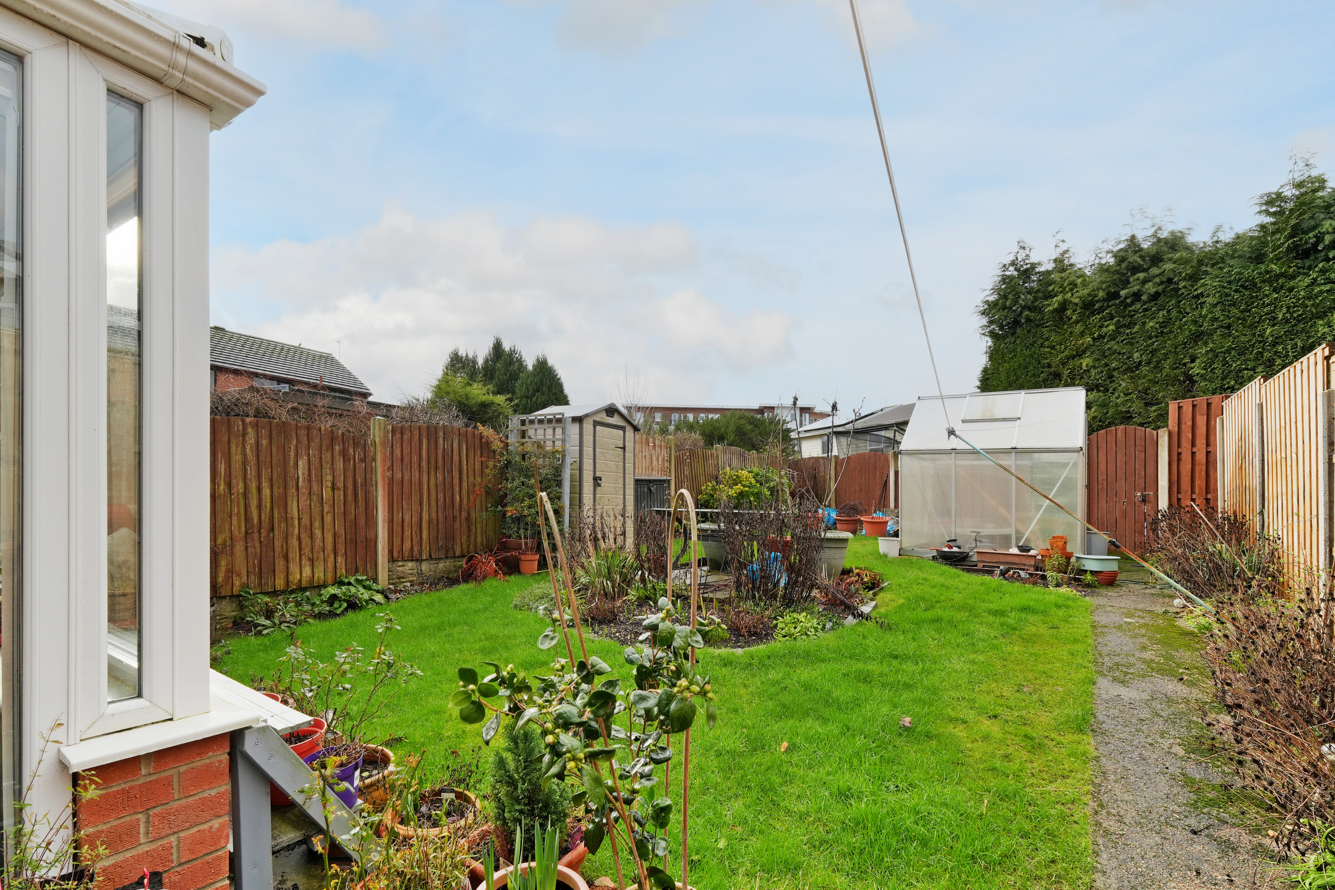 The rear garden is a real bonus. It’s generous in size and well arranged, with a paved patio for outdoor seating, a lawned area, and a greenhouse for anyone with an interest in gardening.