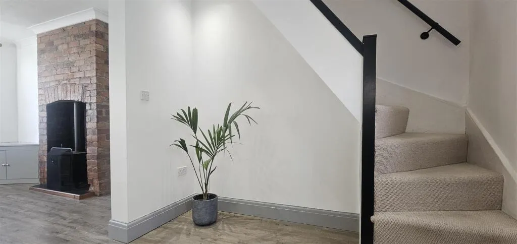 Upon entering, you are welcomed into a bright and modern open-plan ground floor, decorated in neutral tones and finished with laminate flooring throughout. The living area features an attractive Esse wood burning stove with an exposed brick chimney surround, creating a warm and homely focal point.