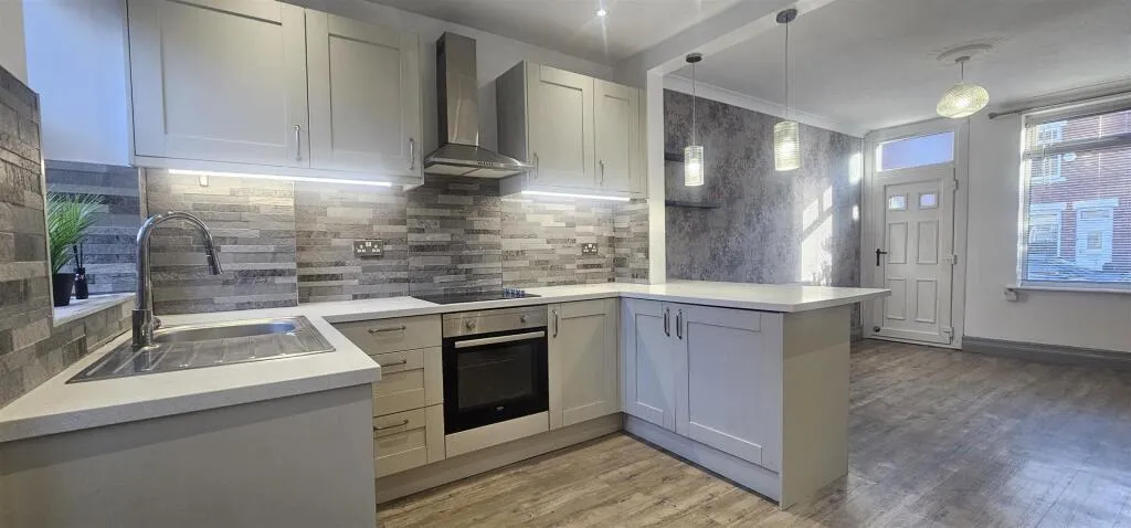 To the rear, the contemporary kitchen is well appointed with an integrated electric hob and oven, and also houses the efficient combi boiler, controlled via a wireless thermostat.